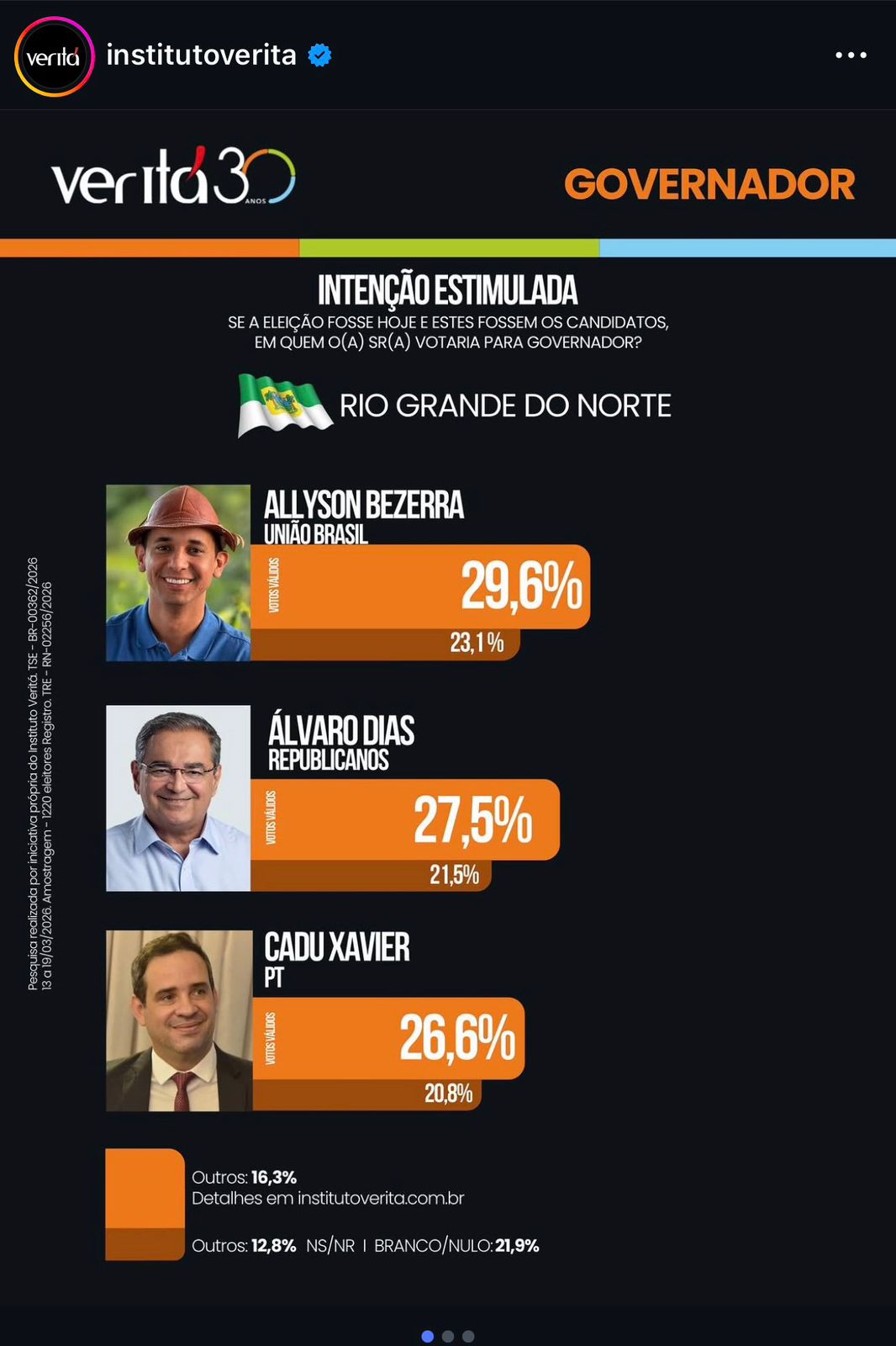 O candidato de Lula disparou na disputa pelo governo do RN. Pesquisa Veritá divulgada nesta quarta-feira (8 de abril) mostra Cadu Xavier, que já é chamado por muitos de “Cadu de Lula”, com 20,8%, em empate técnico com Álvaro Dias (21,5%), o candidato de Bolsonaro, e Allyson Bezerra (23,1%), o ex-prefeito de Mossoró que topou ser o candidato dos Maias e dos Alves.