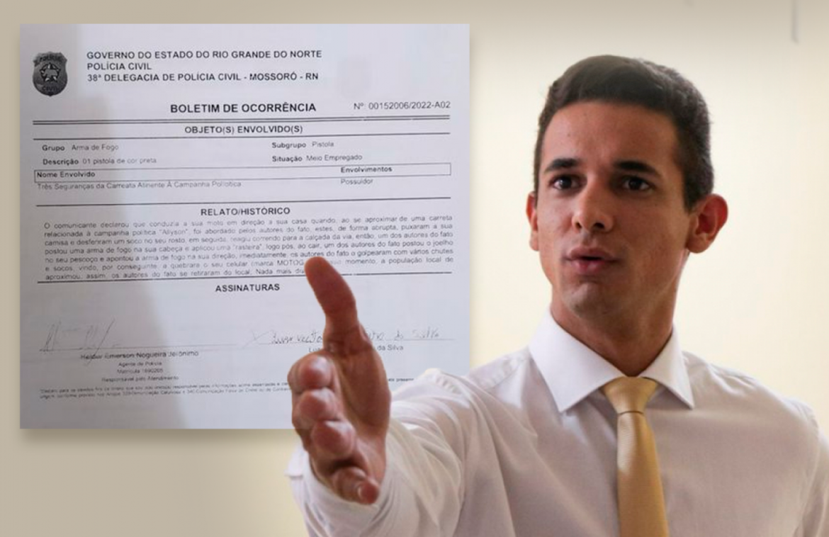 “O comunicante declarou que conduzia a sua moto em direção a sua casa quando, ao se aproximar de uma carreata relacionada à campanha política “Allyson” foi abordado pelos autores do fato, estes, de forma abrupta, puxaram a sua camisa e desferiram um soco no seu rosto, em seguida, reagiu correndo para a calçada da via, então, um dos autores do fato postou uma arma de fogo na sua cabeça e aplicou uma “rasteira”, logo pós, ao cair, um dos autores do fato postou o joelho no seu pescoço e apontou a arma de fogo na sua direção, imediatamente os autores do fato o golpearam com vários chutes e socos, vindo, por conseguinte a quebrar o seu celular (marca MOTOG 9), nesse momento, a população local de aproximou, assim, os autores do fato se retiraram do local, Nada mais disse.”, diz o boletim de ocorrência.