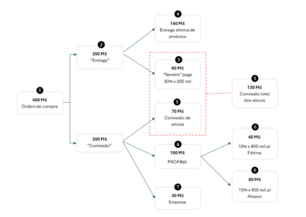 A decisão narra ainda o modus operandi fraudulento: a Prefeitura emitia uma Ordem de Compra no valor de 400 mil reais, mas a empresa entregava efetivamente apenas metade dos produtos, o equivalente a 200 mil reais. O valor restante, pago pelos cofres públicos por bens nunca recebidos, seria utilizado para cobrir as margens de lucro dos empresários e o pagamento das comissões ilícitas aos agentes políticos.
